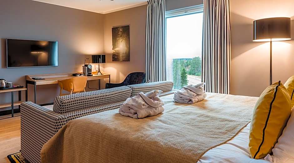 Spacious room including a mini-bar, sofa and flat-screen TV. Bathrobes and slippers are included.